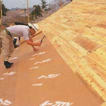 ●熟練した職人の技「柿葺工法」を100%再現できるシート状屋根下葺材。屋根のムレ・結露を防ぐ。吸音性にも優れ、屋根の雨音が静か。