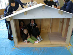 13:00〜15:00 屋根・壁の塗装、漆喰塗り※乾燥時間中は、釘打ちなどの体験コーナーや木製パズル